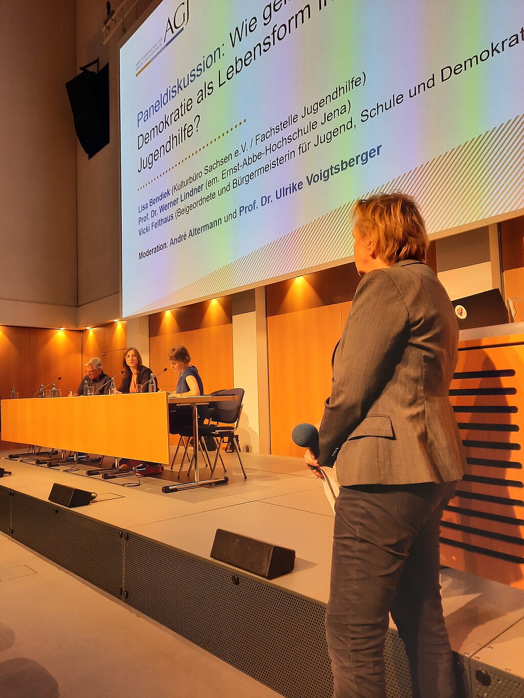 Unter dem Titel „Wir leben Demokratie! – Wirklich?“ lud der AGJ-Fachausschuss III „Qualifizierung, Forschung, Fachkräfte“ am 14. Mai 2025 auf dem 18. Deutschen Kinder- und Jugendhilfetags in Leipzig zu einer Leitveranstaltungen des Fachkongresses ein. Rund 280 Teilnehmende nahmen an der Veranstaltung teil. Ziel der Veranstaltung war es, Gelingensfaktoren von Demokratie als Lebensform in der Kinder- und Jugendhilfe zu reflektieren – mit Fokus auf Handlungsmöglichkeiten, aber auch auf aktuelle Herausforderungen und strukturelle Grenzen. Somit stand die Frage, wie Demokratie als Lebensform im Alltag der Kinder- und Jugendhilfe konkret gefördert und geschützt werden könne ebenfalls im Zentrum.